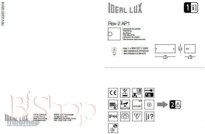 Кількість ламп: 1. Тип цоколя: E27. Висота (див): 12. Глибина (див): 13. Потужність лампи (Вт): 60. Довжина (див): 25.