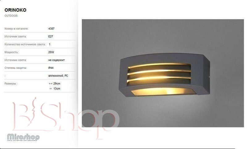 Кількість ламп: 1. Тип цоколя: E27. Ширина (див): 29. Глибина (див): 13. Потужність лампи (Вт): 20. Довжина (см): 29.