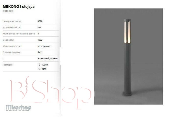Кількість ламп: 1. Тип цоколя: E27. Висота (див): 100. Потужність лампи (Вт): 60. Діаметр (см): 9.